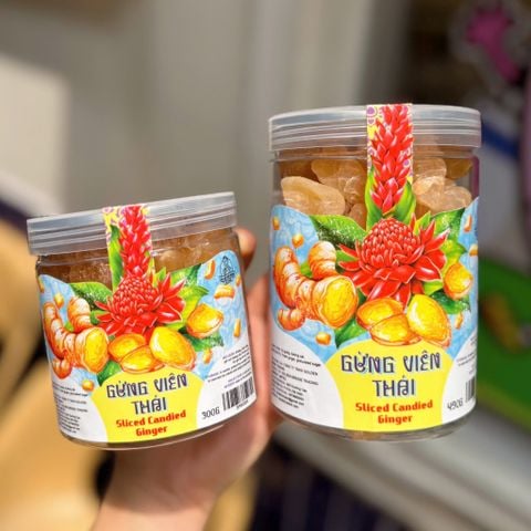 Mứt gừng viên được làm từ trái cây tươi, ép dẻo sau đó sấy lạnh nên khi ăn sẽ có cảm giác đọng lại chút ngọt thanh như bản chất đúng của trái gừng tươi luôn ạ.