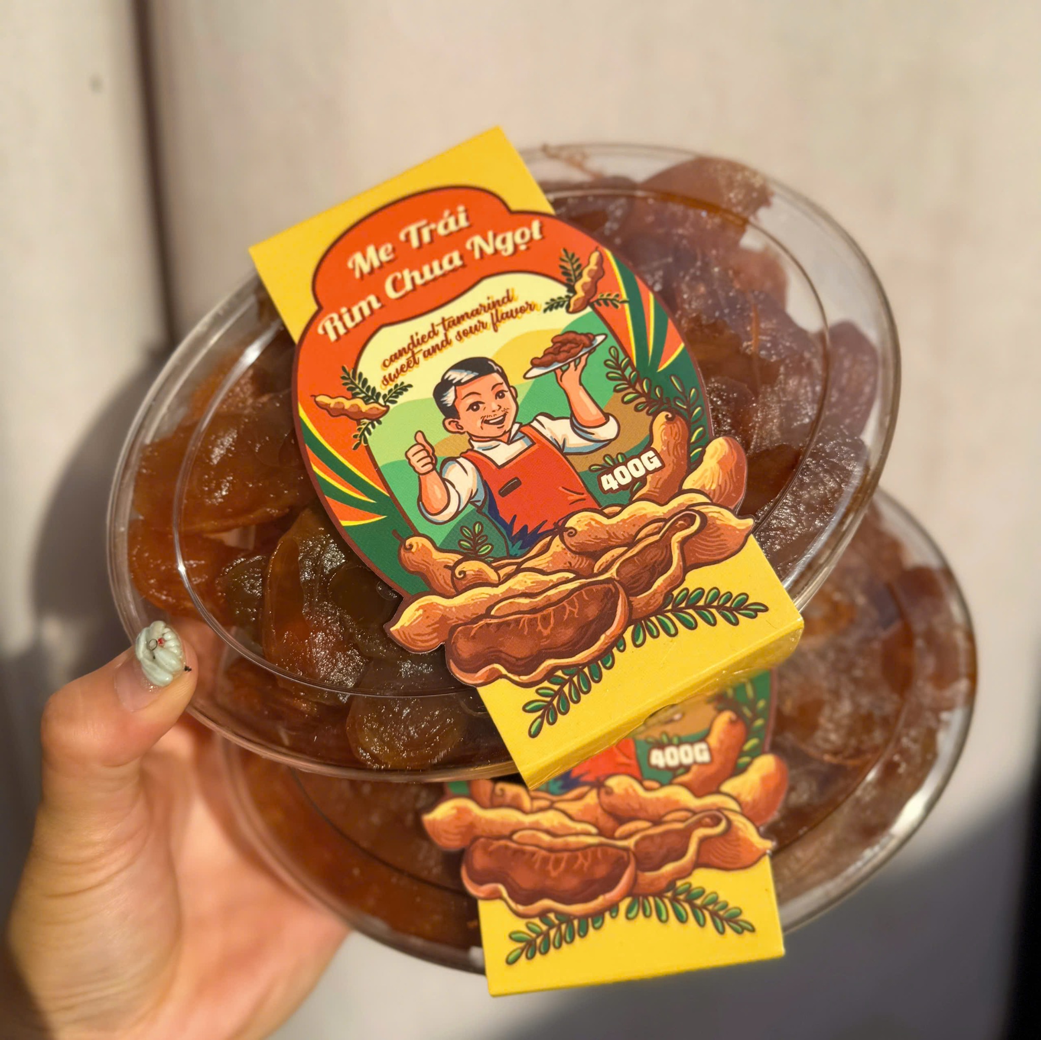 Me rim lò thủ công làm phơi đủ nắng nên trái me khô ráo hơi giòn, vị ngọt chua nhiều chứ không ngọt gắt như những chỗ khác.